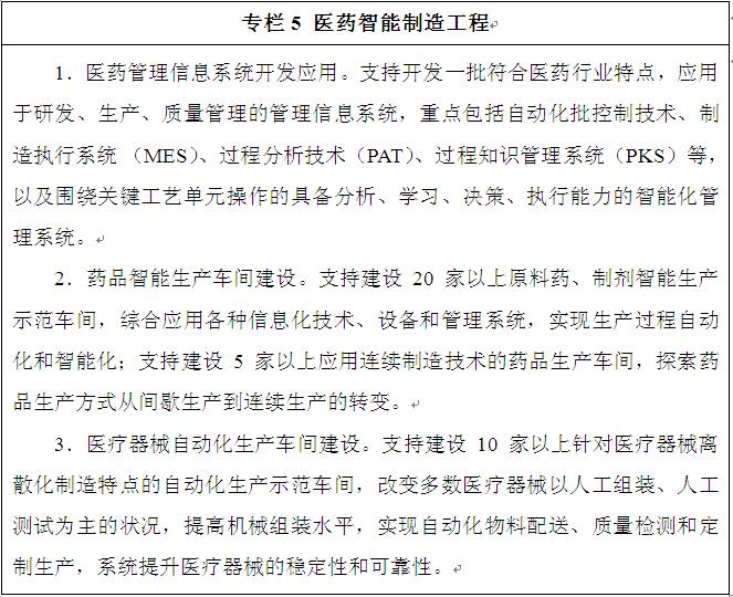 ——智能制造。到2020年,醫(yī)藥生產(chǎn)過程自動化、信息化水平顯著提升,大型企業(yè)關鍵工藝過程基本實現(xiàn)自動化,制造執(zhí)行系統(tǒng)(MES)使用率達到30%以上,建成一批智能制造示范車間。